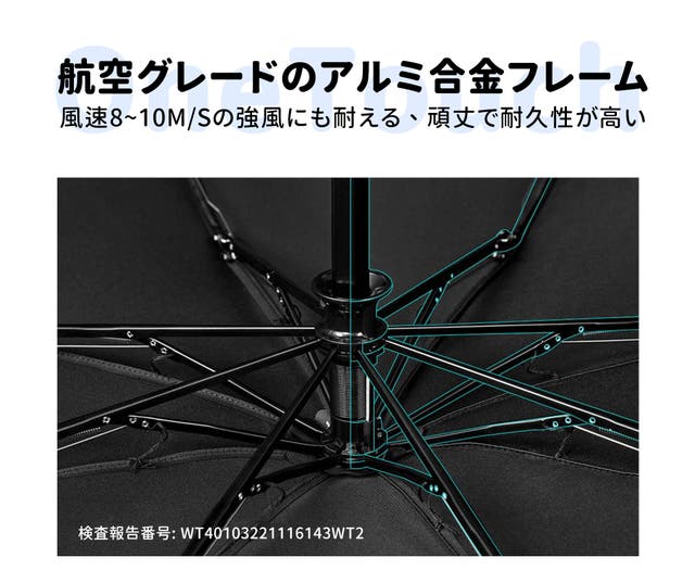 傘のフレームは航空グレードのアルミ合金素材を使用しており、さらに高強度ファイバーダブルフレームでサポートされています。この設計により、頑丈さを保ちながらも、しなやかで反発力が強く、傘の安定性と信頼性が向上します。