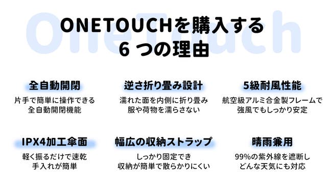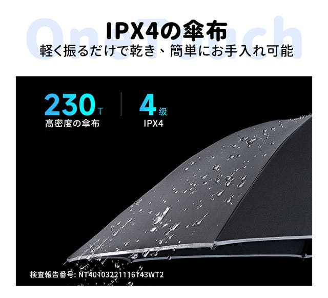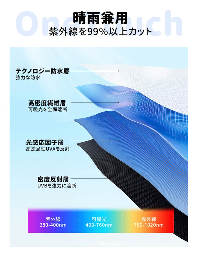 OneTouch電気ワンタッチ傘は、4層構造の素材を使用し、特に紫外線防止のために3層の特殊生地を採用しています。