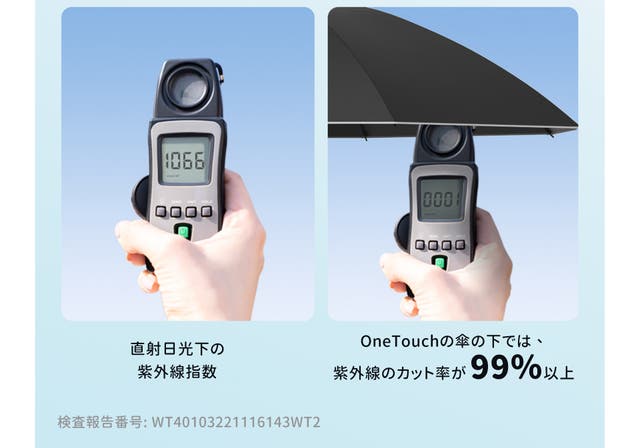 テストの結果、高性能の透明保護コーティングを施した傘面は、紫外線を99%以上カットし、UPF50+の防護効果を発揮します。ダブルUVカット&遮熱効果で、体感温度も下がり、外が炎天下でも傘の下は涼しく快適です。