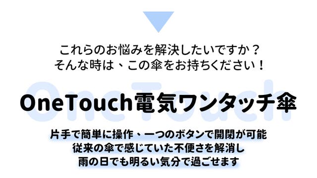 「Makuake(マクアケ)」は、実行者の想いを応援購入によって実現するアタラシイものやサービスのプラットフォームです。このページは、 プロダクトカテゴリの 「OneTouch電気傘 | 片手で全自動開閉、簡単操作でどんな天候にもこれ一つ」プロジェクト詳細ページです。