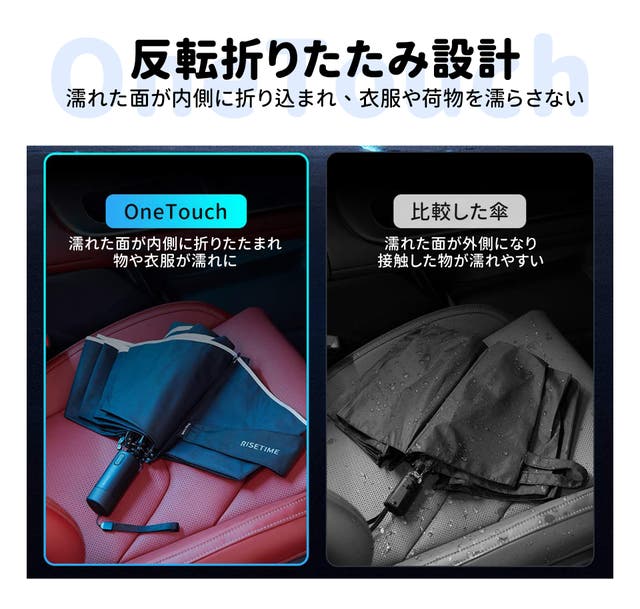 - 逆折り畳み設計:濡れた傘面が内側に折りたたまれるため、衣服や車内を濡らす心配がありません。