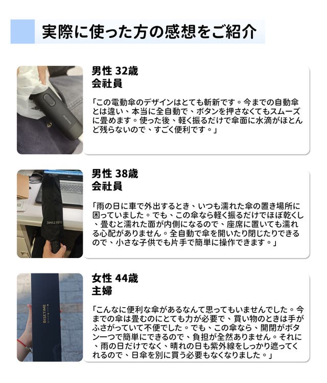 - 全自動電動開閉:ボタンを押すだけで、2秒以内に片手で簡単に開閉が可能。