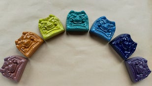 和瓦特有の「いぶし銀色」に加え、屋根瓦の着色に使われる釉薬を使うことでにじの7色展開が可能になりました。(いぶし銀色の鬼瓦ペーパーウェイトは既に商品化済みのため、今回のプロジェクトでは選択できません。)