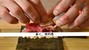 江戸前寿司の伝統を守りつつ、独創性に溢れ、ミシュラン一つ星を獲得した「天婦羅みやしろ」の天ぷら手巻き(海老天海苔巻き)をご提供します。
