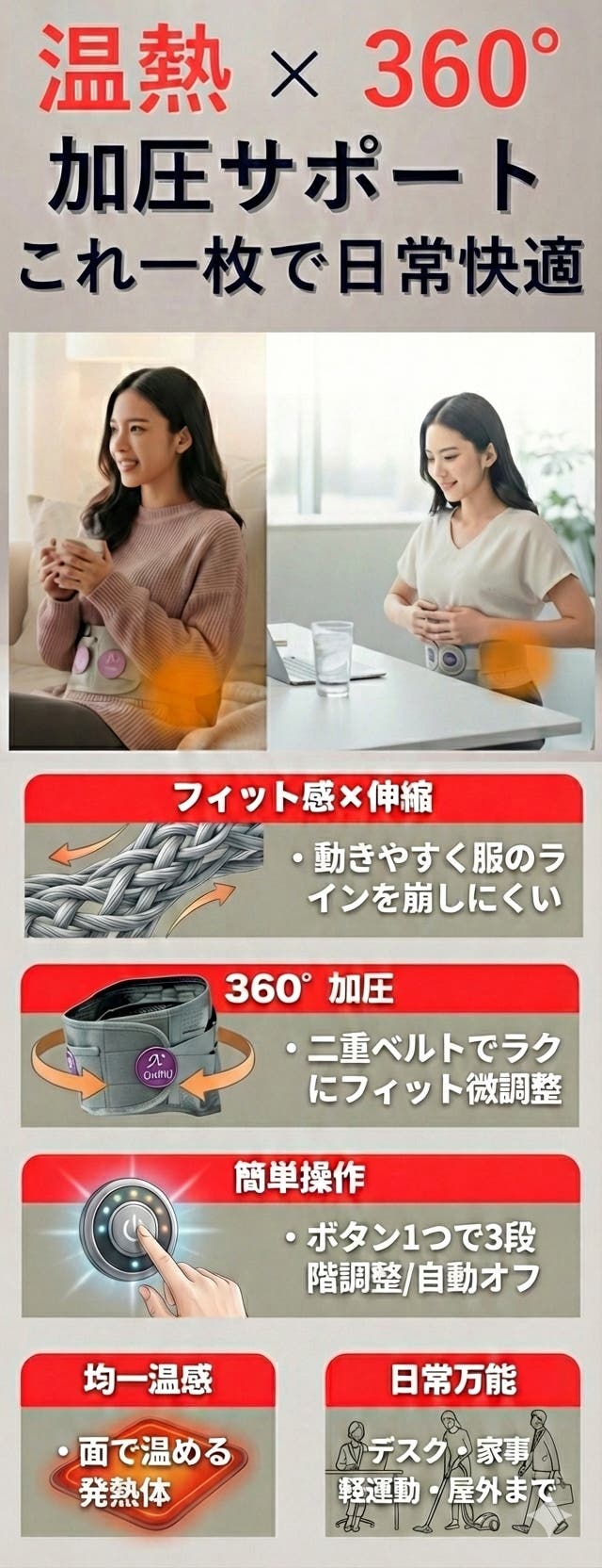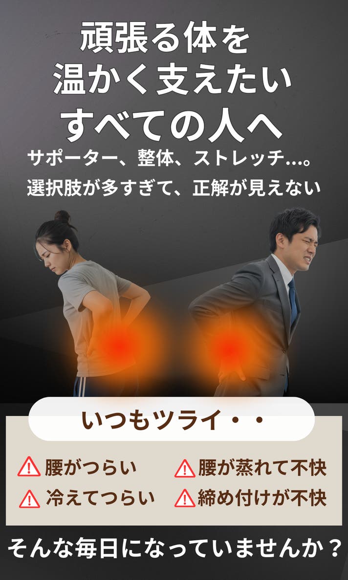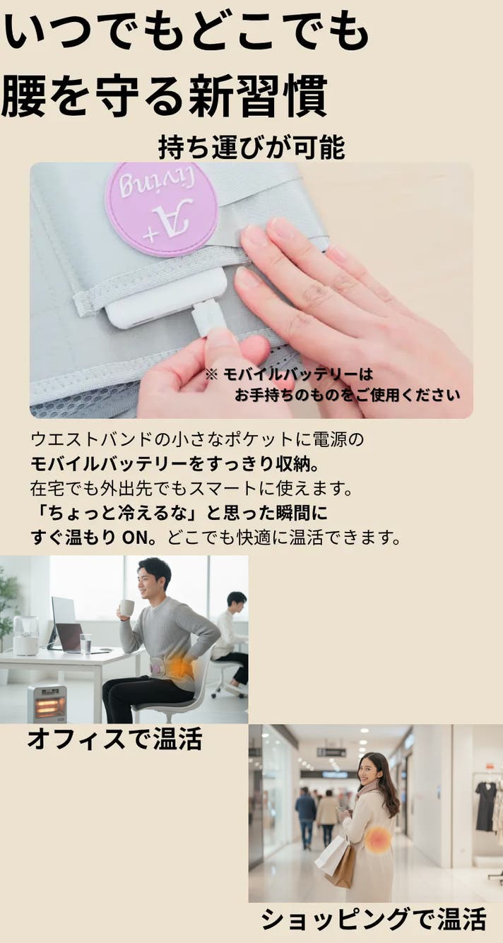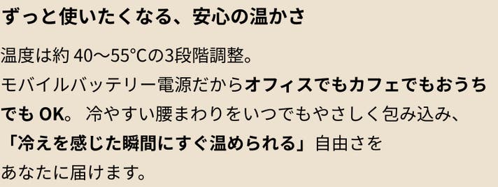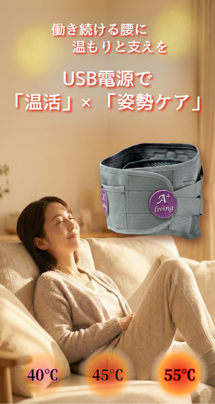 - USB給電で温感ケアと腰サポートを1枚で。忙しい毎日の腰まわりにそっと“ラク”を足します