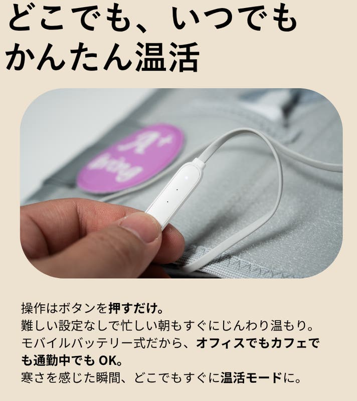 - 服の下でも目立ちにくい薄型設計。面発熱でムラなく温まり、必要な時だけ温感ONでスマートに
