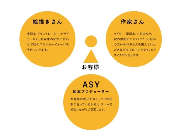 Only One絵本は、プロの絵描きさん、作家さん、ASY絵本プロデューサーが、あなた専属のチームとなり、ヒアリングから制作まで一貫して携わります。