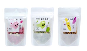- 第一弾は富山の豆菓子“コルコル ”(2種) と、茨城の干し芋かりんとう“カリポリ” 。