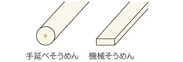 そうめんには「手延べそうめん」と「機械そうめん」の2種類があります。手延べそうめんは、縄状にした生地に撚りをかけて2本の箸に渡したものを細くしていく製法。熟成と撚っては延ばす工程を繰り返すことで、小麦粉に含まれるグルテンがデンプン粉を一定方向へ延びて形成されます。包み込むように。それが滑らかな食感とコシを表現し、つるつるののど越しを生み出します。