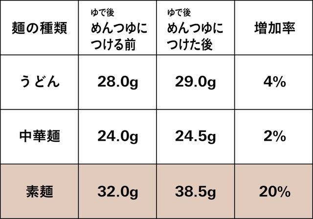 ②各麺を共通のめんつゆにサッとつけ、めんつゆをつける前とつけた後の重量を比較し、付着しためんつゆの重量の増加率を比較する