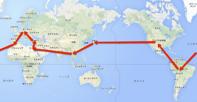 日本 → タイ → エジプト → トルコ → ヨーロッパ → モロッコ → 南米 → 北米 → 日本