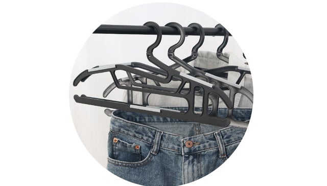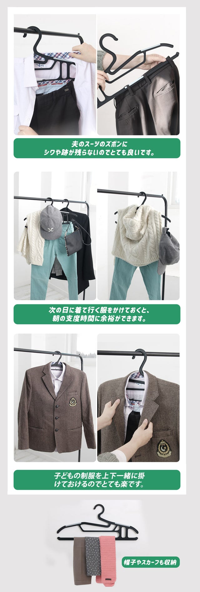 - 洗濯物にシワがなしでズボン、ニット、スーツを1つのハンガーにクローゼットに手軽に収納・整理