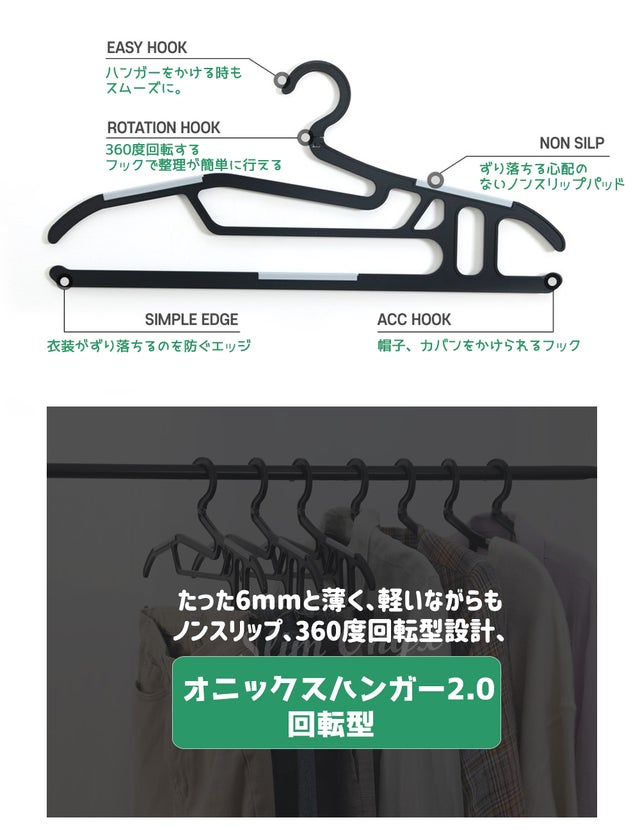 当社は、33年間に渡り完璧な製品開発のため研究を重ねて参りました。 昨年、オニックスハンガーを初めて発売し、ありがたいことに100万個超える販売数を記録しました。ですが、そこに留まらず持続的に改善点を見出し、世界中のどんなハンガーより簡単に使用でき、かつ耐久性も抜群なハンガーの完成のために数多くのサンプリングを通じて設計しました。「より良いリターンでご満足していただきたい。」という考えのもと開発しました。