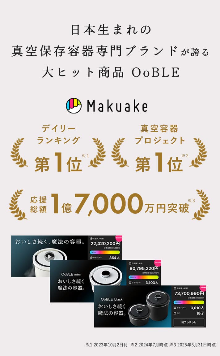 弊社は真空保存容器専門ブランドとして誕生し、2023年にMakuake第1弾でOoBLE whiteが2,000万円の応援を達成。第2弾・第3弾総額で1億7,000万円を超える応援購入をいただきました。