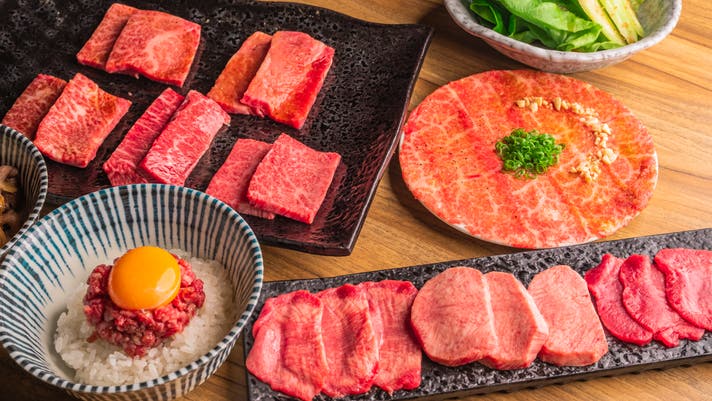 日本三大和牛のひとつ、滋賀県産「近江牛」をふんだんに使用したおまかせ焼肉コース。とろけるような霜降りと上品な甘みが特徴の近江牛を、部位ごとに楽しめる内容となっております。前菜からデザートまで、旬の食材と共に味わう極上のひとときをお楽しみください。