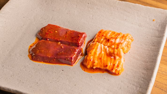 味噌で極まる、近江牛ホルモンの旨味。自家製・秘伝の味噌が、ぷるんと濃厚な2種を包む。