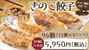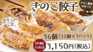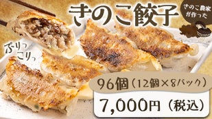 きのこ農家の餃子ですから、きのこの香りと旨味をぎゅっと包んでプリップリ食感を楽しめる“きのこ好きにはたまらない餃子”に仕上げました。 化学調味料、着色料、保存料を使用せず、素材の美味しさをいただいてほしいと試作を重ね、他原料にもこだわり納得のいくきのこ餃子が完成しました。
