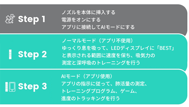 軽量で小型のボディに、負荷トレーニング、肺活量測定、AIコーチングの3つの機能を搭載しています。