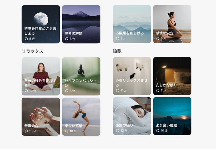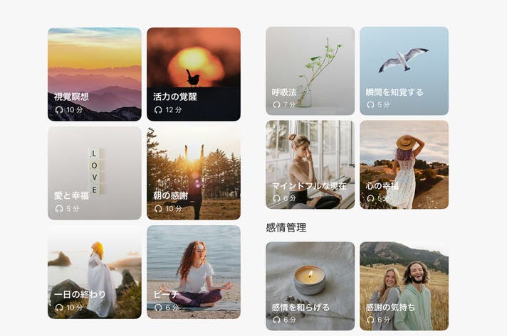 アプリ内の瞑想コンテンツでは、「朝の感謝」や「思考の解放」など、