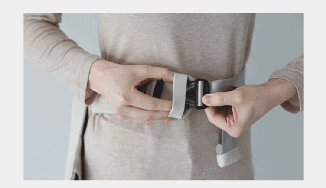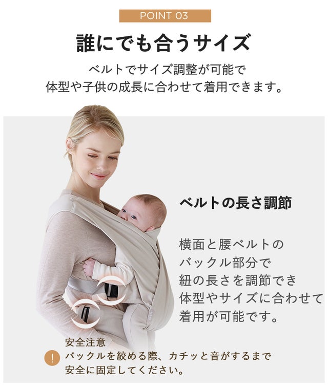 一般的なスリングはサイズ調整がむずかしく、サイズが大きすぎると密着感がなくなり、赤ちゃんが落ち着いてくれなかったり、また小さすぎると赤ちゃんは息苦しく感じて抱っこを嫌がることがあります。肩から伸びる横面のベルトと腰ベルトの両方がサイズ調整でき、ママや赤ちゃんの服の厚みや、パパや祖父母など着用者の体系の違いに合わせ簡単にサイズを調整することができます。