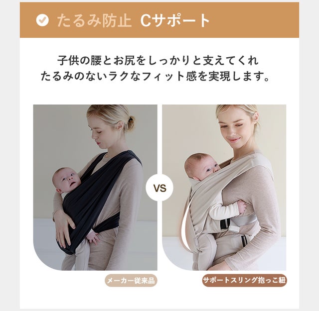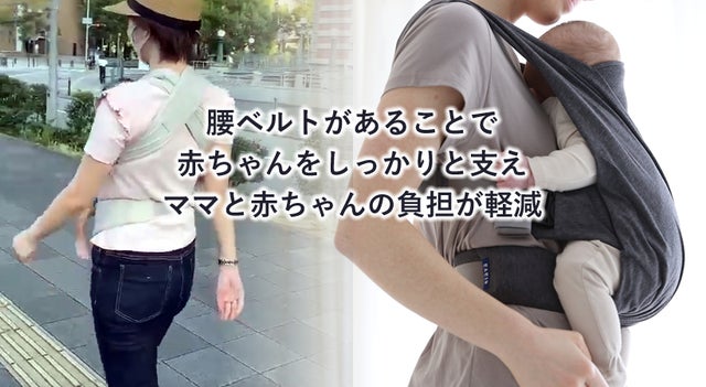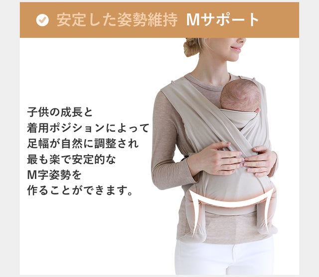 腰ベルトがあるのでママの腰でも赤ちゃんをしっかりと支え、太ももとお尻がしっかりとサポートされることによって、赤ちゃんとママがしっかりと密着し「赤ちゃんと一体になる」ことができて、安定した姿勢を保つことができます。