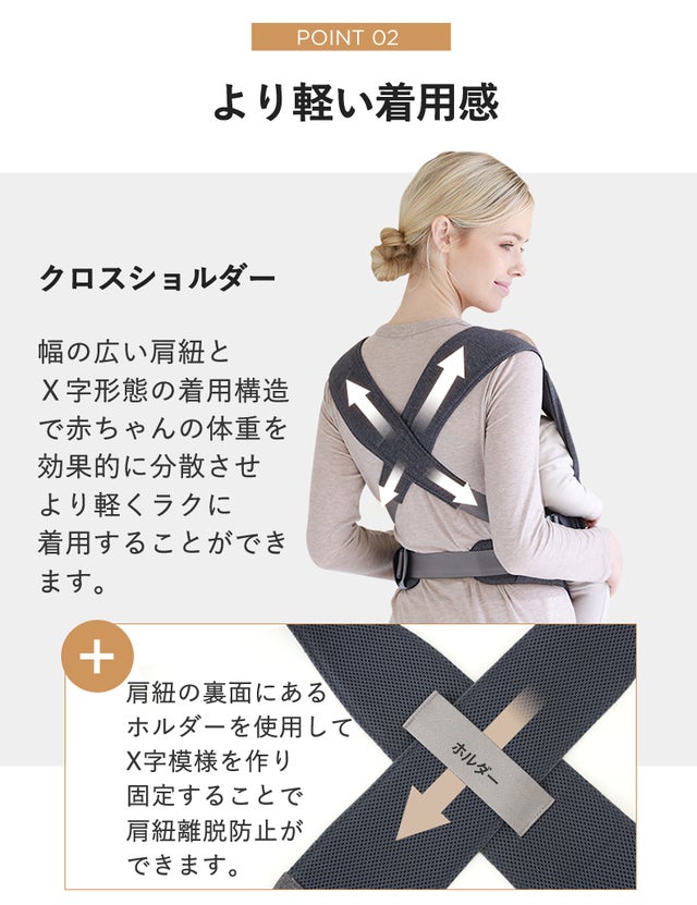 赤ちゃんの体重を効率よく分散させることにより、ママの身体への負荷を軽減させることができます。また、裏面にあるホルダーに肩紐を通すことで肩紐の離脱防止をすることができます。
