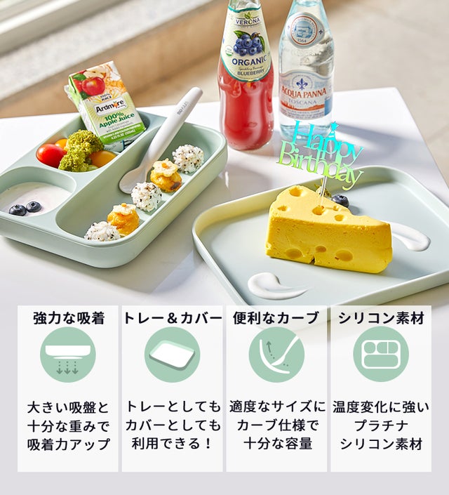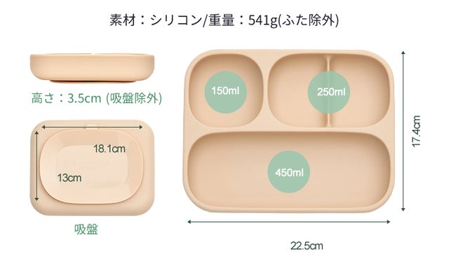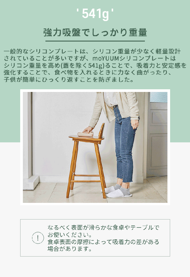 プレートの底面に吸盤が付いているので、お子様がひっくり返してしまう心配がありません。プレートの重さも541g(プレートのみ)で、簡単に動かないようにあえて重みを持たせています。