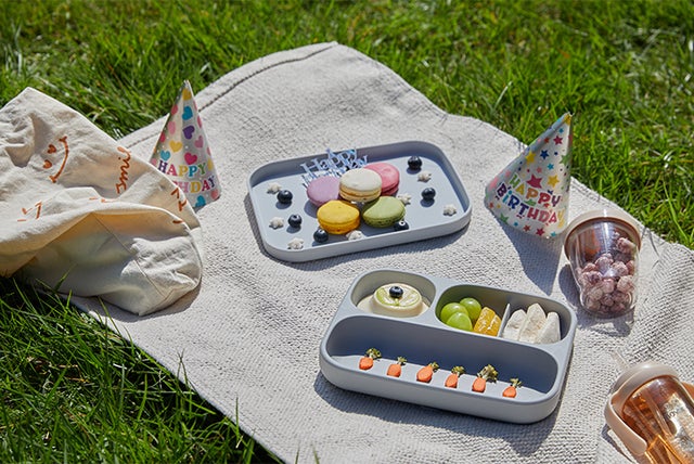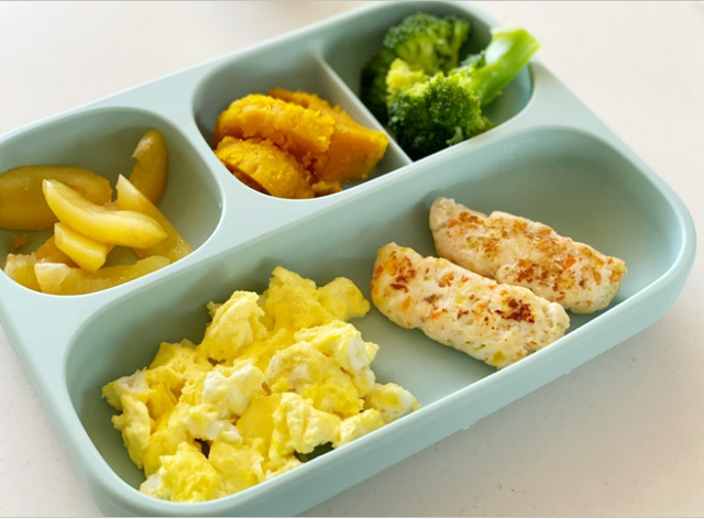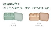 バランスの取れた栄養献立のため仕切りをつけ、もっとも広い面には目盛り表示をつけました。ここは野菜・ここは果物など入れる場所を分けることで、栄養を意識した献立にしてあげましょう。