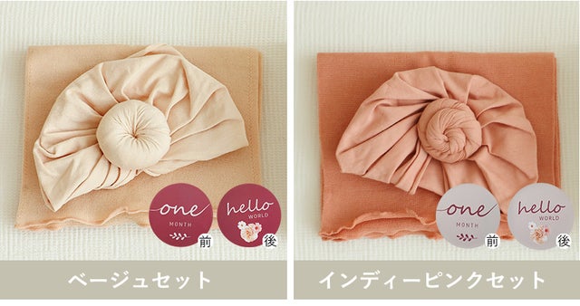スワドル本体とヘアバンド、生後1か月の記念に写真を撮影するフォトアイテムとしてマンスリーカードをセットにしてお届けします。