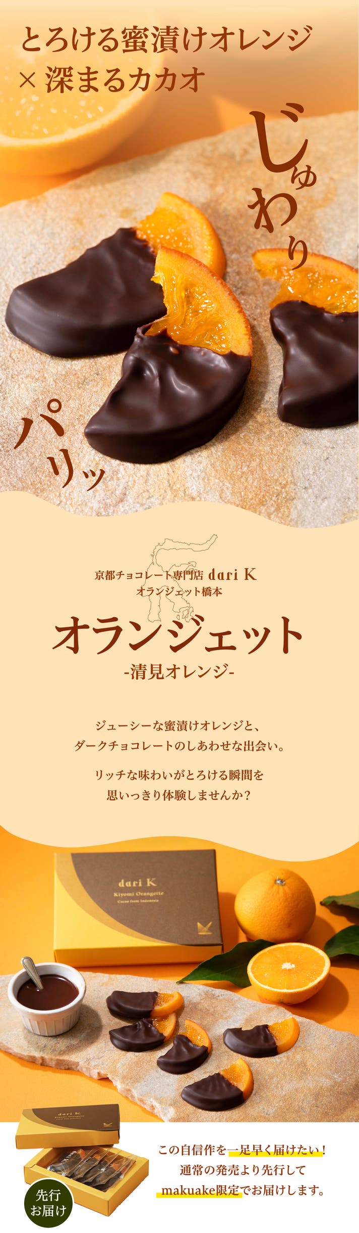 「Makuake(マクアケ)」は、実行者の想いを応援購入によって実現するアタラシイものやサービスのプラットフォームです。このページは、 フードカテゴリの 「柑橘の果実感とカカオの余韻。チョコレート専門店の極上「オランジェット」」プロジェクト詳細ページです。