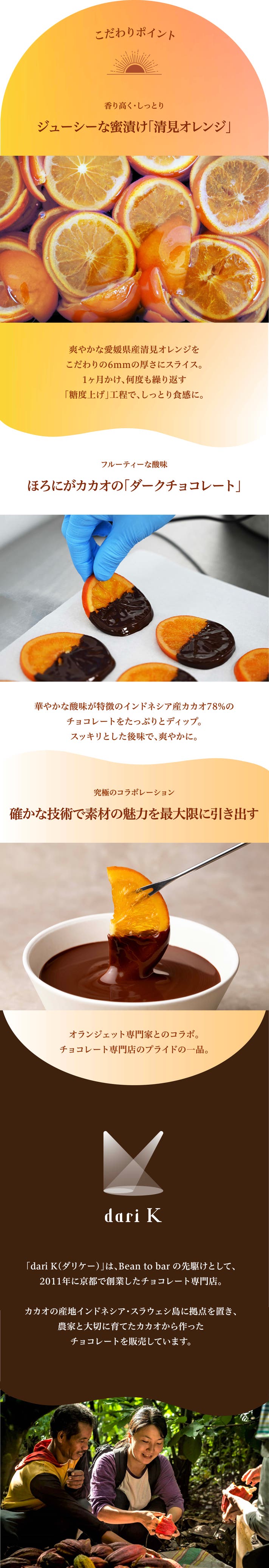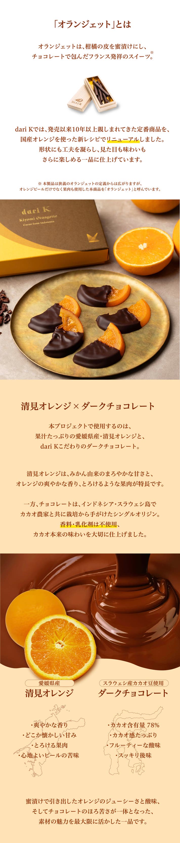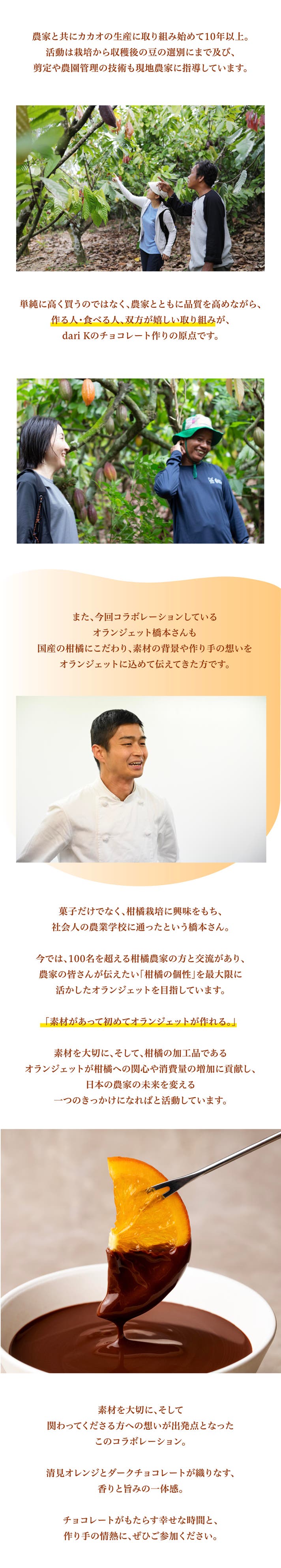 - 爽やかな愛媛県産「清見オレンジ」× カカオ栽培から携わるこだわりの「ビターチョコレート」