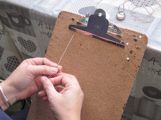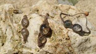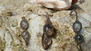 ジュエリーは蝋引きの糸を使って自然石を包み、デザインを作りながら編み込みます。