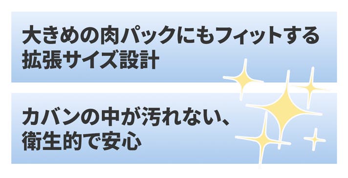また、ぴったりと包める構造で、エコバッグへの液漏れやにおい移りもしっかり防止。清潔に持ち運べて安心です。