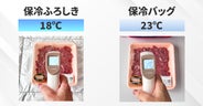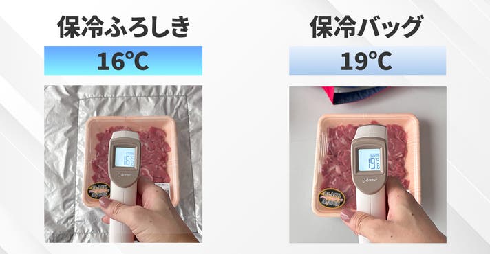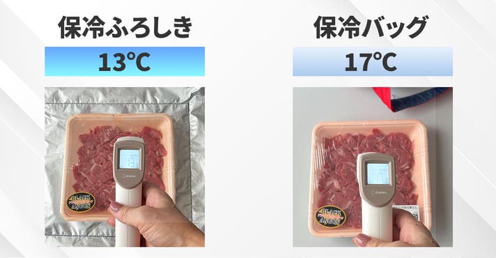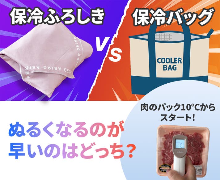 私たちは実験を行いました。約30℃の車内で、保冷ふろしきで包んだ肉のパックと市販の保冷バッグとではどちらが肉の保冷時間が持続するか、比較してみました。