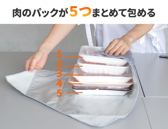 まとめ買いの日も、お肉をたくさん買った日も大丈夫。これ1枚で、最大5パックまとめて包めます。