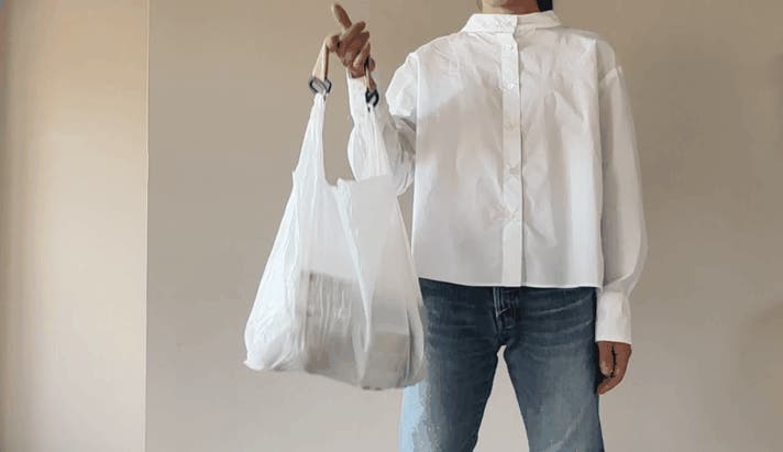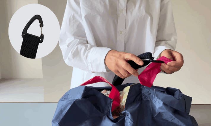 エコバッグの持ち手に「通して、パチッ」と留めるだけ。たったそれだけで、