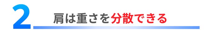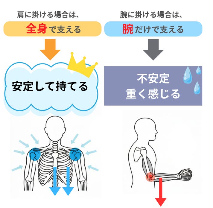 肩は筋肉も広さもあるので、全身で支えやすい構造。同じ重さでも「安定して持てる」と感じやすい。