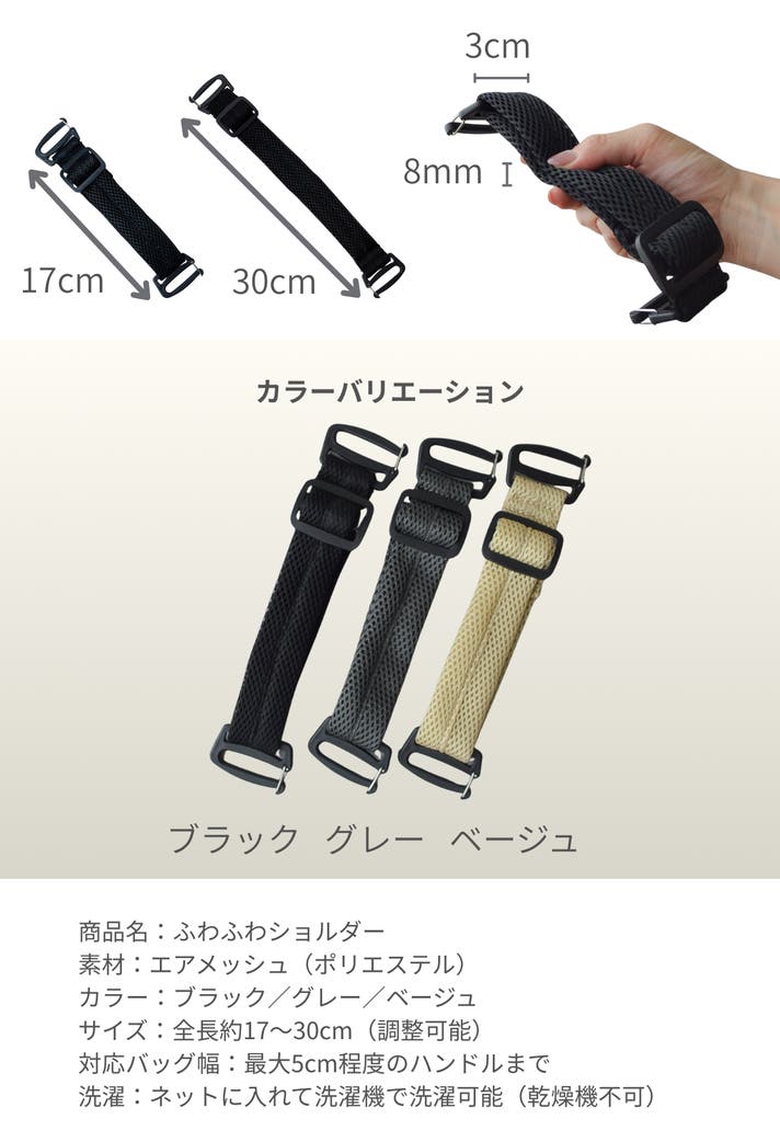 「ふわふわショルダー」は、どんな袋やエコバッグにも取り付けられる肩掛け用の延長ショルダーです。