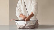 A:折り目に合わせてたたみ、上から重いものを乗せてペタンコにしていただくことをオススメします。アイロンをかける場合は、必ず当て布をして低温でかけるようにしてください。