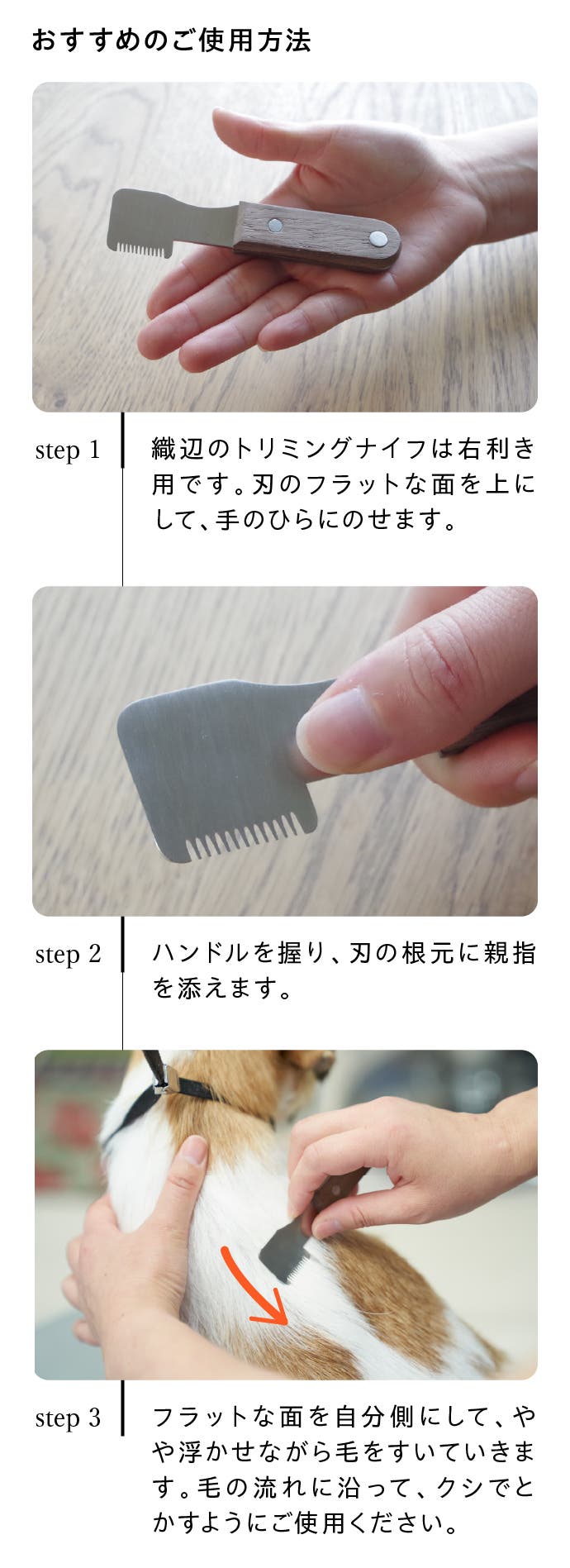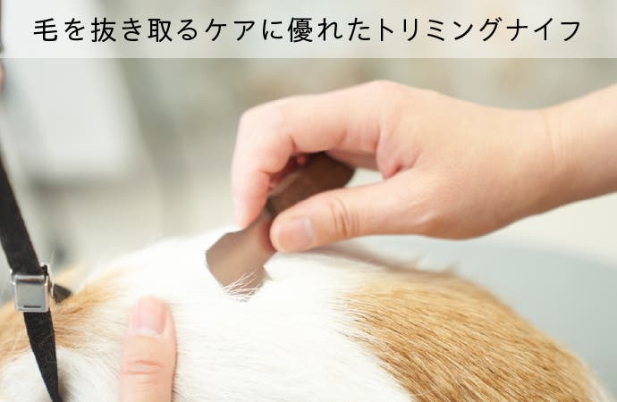 そこで、おすすめするのがトリミングナイフ。カットするのではなく、指とナイフで古い毛を挟んで「抜く」のです。そうすることで、新しい毛の育成を助け、自慢の毛並みを維持することができます。