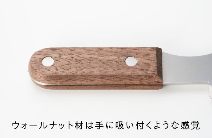 ハンドル部分の素材はウォールナット。ほかの木材に比べて、しっとりとした手触りで、使い込むほどに手になじむ感覚が魅力です。