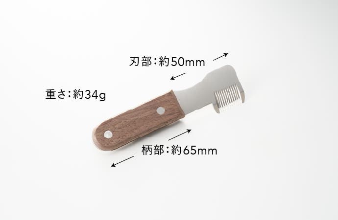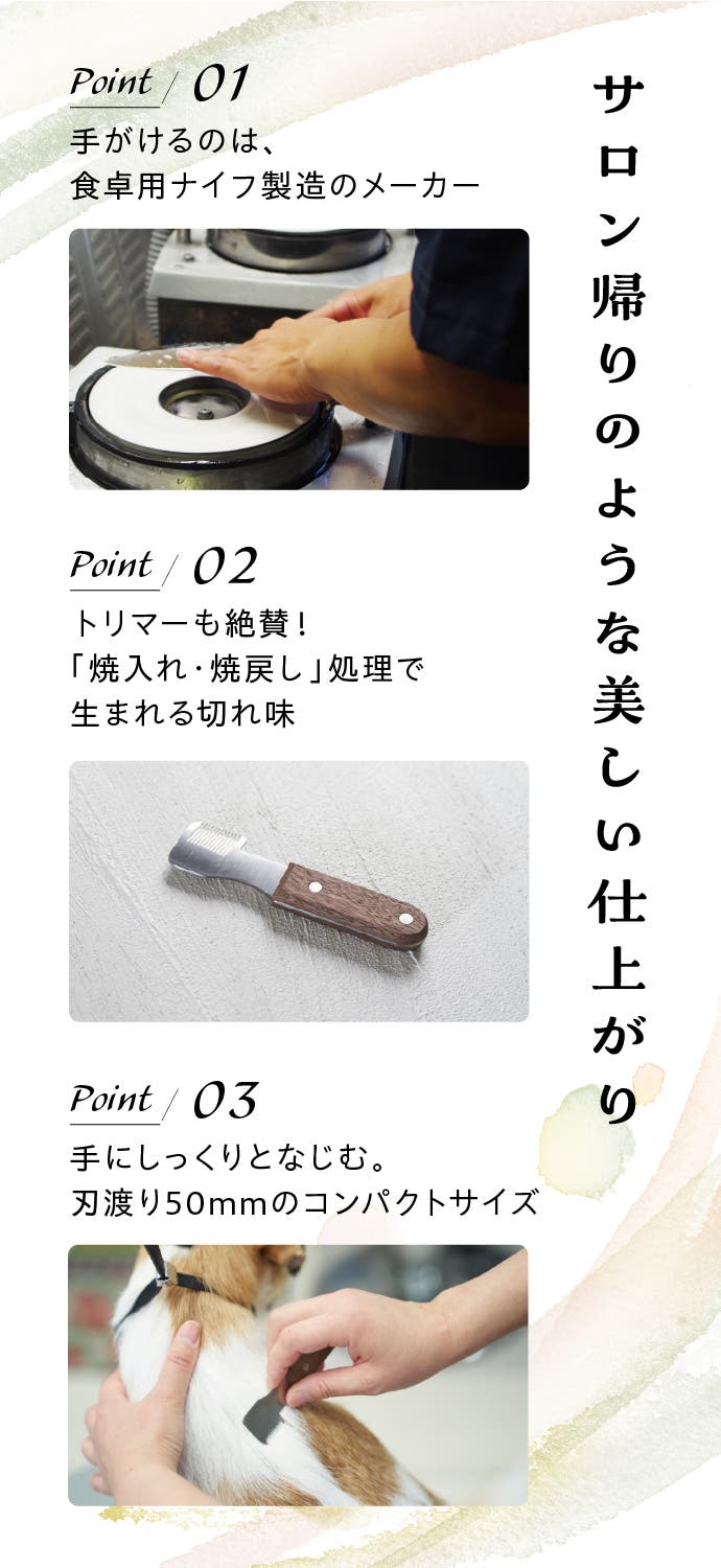 - 刃渡り50mmのコンパクトサイズ。小回りが利くため、トリミング初心者でも扱いやすいナイフです