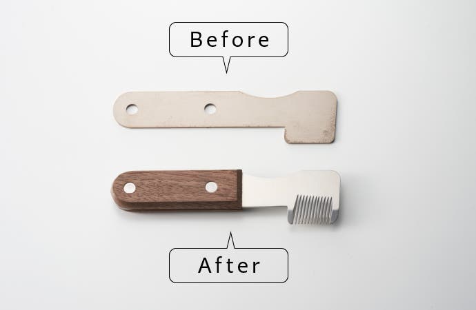 織辺のトリミングナイフは、包丁と同じ「焼入れ・焼戻し」という処理を施しました。まずは、1000度以上の高温で加熱し、硬度を高めてから急冷します(焼入れ)。しかし、この状態では金属の組織が不安定なため、今度は200度台で再加熱します(焼戻し)。そうすることで、金属の組織が安定し、耐久性と切れ味を兼ね備えたナイフに仕上がるのです。