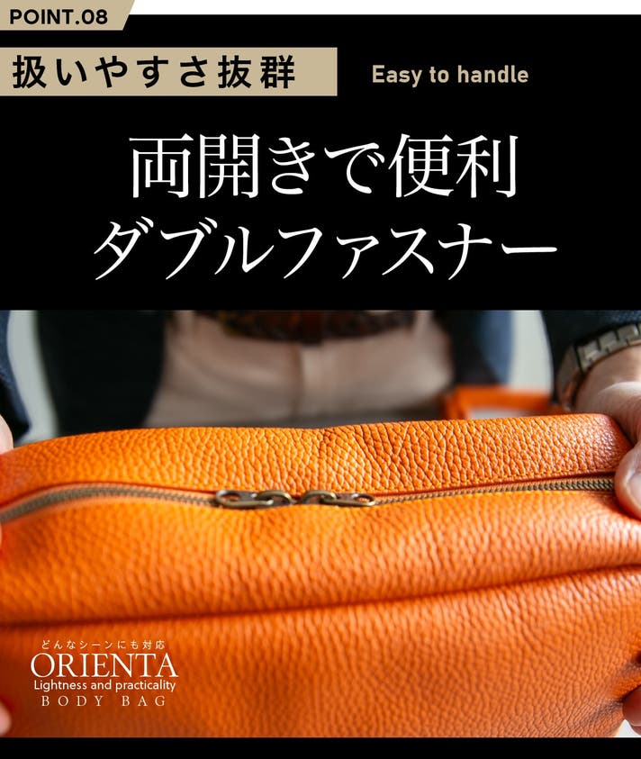 ダブルファスナー仕様で、左右どちらからでもスムーズに開閉可能。使うシーンや持ち方に応じて柔軟に対応できるため、忙しい毎日のストレスを軽減します。