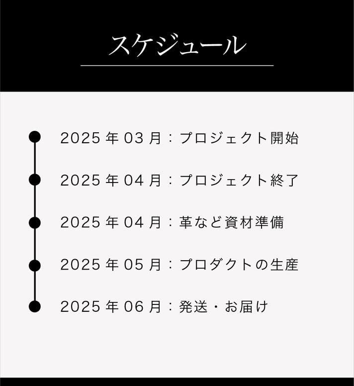 ※製造及び品質向上のため、予告なしに製品仕様及びデザインを変更する場合がございます。 ※天然の牛革を使用しております。小さい色むら、バラ傷がある場合があります。革の個性としてご理解ください。 ※モニター環境により、実際の商品の色合いは多少異なって見える場合があります。 ※ご注文状況、使用原料の供給状況、製造工程上の都合等により、出荷時期が遅れる場合がございます。 ※本文中に記載させていただいたスケジュールは、あくまでプロジェクト公開時点の予定です。プロジェクトの性質上、配送遅延のおそれがございます。原則として、配送遅延に伴うキャンセルはできませんが、リターン配送予定月から3ヶ月を超えた場合には、希望者に限りキャンセルにて対応させていただきます。