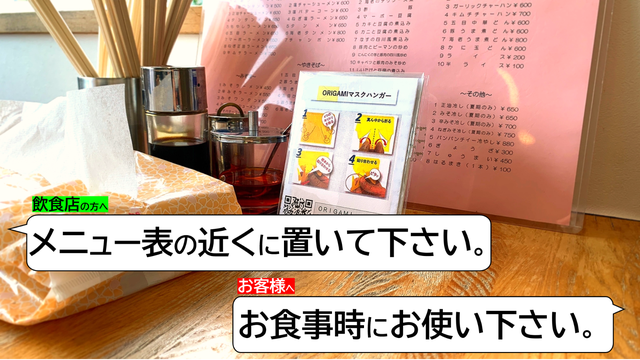 飲食店では注文後、料理を待っている間にマスクハンガーを作成し、料理が届きましたらマスクを掛けて、食事をお楽しみ下さい。