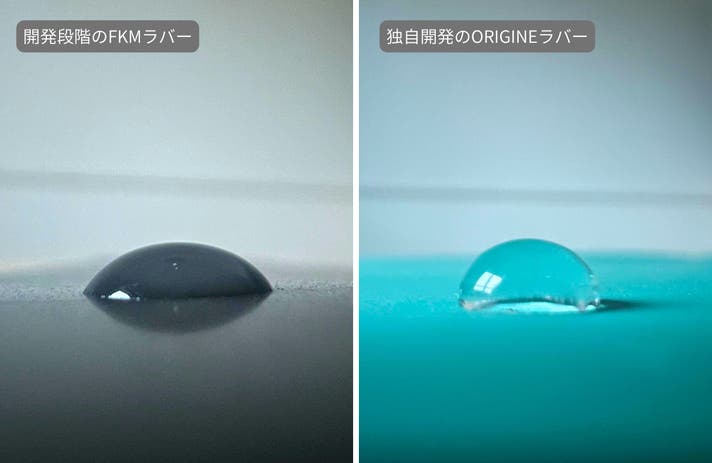左:開発段階のFKMラバー 右:ORIGINEの独自開発ラバー