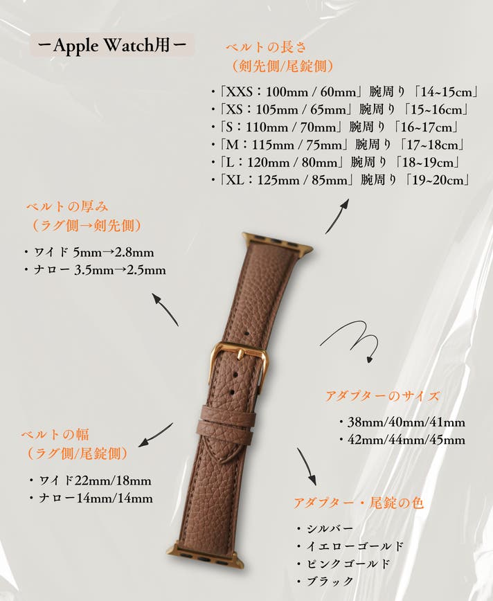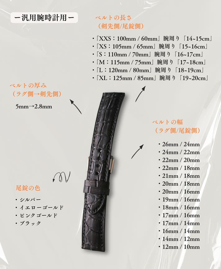 腕周りの長さは参考値となりますので、現在取り付いているベルトの長さを確認の上、ご選択ください。