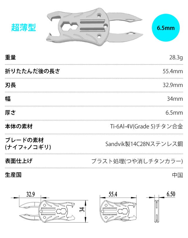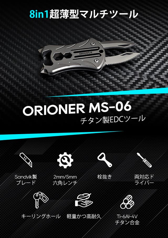 ポケットに入れたら、存在さえ忘れる——それがOrioners MS-06です。Ti-6Al-4Vチタン合金製の小さなボディに、サンドビック製ナイフやノコギリなど8機能を凝縮。