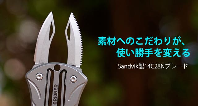 折りたたみナイフとノコギリは、スウェーデンの素材メーカー、サンドビック社が刃物のために開発したステンレス鋼「14C28N」を採用。14%のクロムによる高い耐食性と、0.62%の炭素によるバランスの良い硬度が特長です。